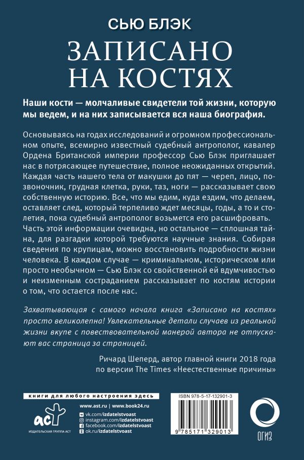 Новая книга автора бестселлера The Sunday Times «Все, что осталось»!, Наши кости— молчаливые свидетели той жизни, которую мыведем, инаних записывается вся наша биография., Основываясь нагодах исследований иогромном профессиональном опыте, всемирно известный судебный антрополог, кавалер Ордена Британской империи профессор Сью Блэк приглашает нас впотрясающее путешествие, полное неожиданных открытий. Каждая часть нашего тела отмакушки допят— череп, лицо, позвоночник, грудная клетка, руки, таз, ноги— рассказывает свою собственную историю. Все, что мыедим, куда ездим, что делаем, оставляет след, который терпеливо ждет месяцы, годы, атоистолетия, пока судебный антрополог возьмется его расшифровать., Часть этой информации очевидна, ноостальное— сплошная тайна, для разгадки которой требуются научные знания. Собирая сведения покрупицам, можно восстановить подробности жизни человека. Вкаждом случае— криминальном, историческом или просто необычном— Сью Блэк сосвойственной ейвдумчивостью инеизменным состраданием рассказывает покостям истории отом, что остается после нас., «Захватывающая ссамого начала книга „Записано накостях“ просто великолепна! Увлекательные детали случаев изреальной жизни вкупе сповествовательной манерой автора неотпускают вас страница застраницей»., Ричард Шеперд, автор главной книги 2018 года поверсии The Times «Неестественные причины»