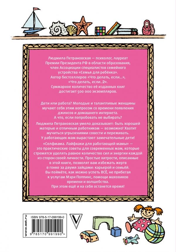 Дети или работа? Молодые италантливые женщины мучают себя этим вопросом современи появления джинсов идомашнего интернета. Ачто, если попробовать невыбирать? Людмила Петрановская умело доказывает: быть хорошей матерью иотличным работником— возможно! Хватит мучиться угрызениями совести ипереживать. Уработающих мам вырастают замечательные дети!, «Селфмама. Лайфхаки для работающей мамы»— это практические советы для современных мам, которые стремятся уделять равное количество сил иэнергии каждой изсторон своей личности. Простые хитрости, описанные вэтой книге, позволят вам избежать жертв вгонке задвумя зайцами: карьерой исемьей. Выпоймете, как можно успеть все, неприбегая куслугам Мэри Поппинс, помощи маховиков времени иволшебства., Купить книгу в Лабиринт.ру Купить книгу на OZON.ru, Selfmama – это абсолютно новый взгляд на образ современной мамы. Попробуйте большую часть дня проработать в офисе, а оставшееся время уделить детям и мужу. Людмила Петрановская предлагает целую книгу разнообразных лайфхаков, с помощью которых жизнь работающей мамы станет гораздо менее загруженной. Благодаря этой книге вы поймете, что хорошая мать и отличный работник в одном лице – это отнюдь не фантастика., Людмила Владимировна Петрановская — российский психолог, педагог и публицист. На протяжении многих лет занималась психологическими проблемами усыновления, в 2012 году создала Институт развития семейного устройства — общественную организацию, обучающую будущих приёмных родителей. В 2002 году удостоена Премии Президента РФ в области образования., Воспитание детей, как известно, дело очень непростое. Молодые и талантливые женщины мучают себя выбором между детьми и работой. А что, если попробовать не выбирать?, Несмотря на то, что книга издана в твердой обложке, она очень легкая и компактная, поэтому не займет много места в сумочке даже самой занятой мамы.