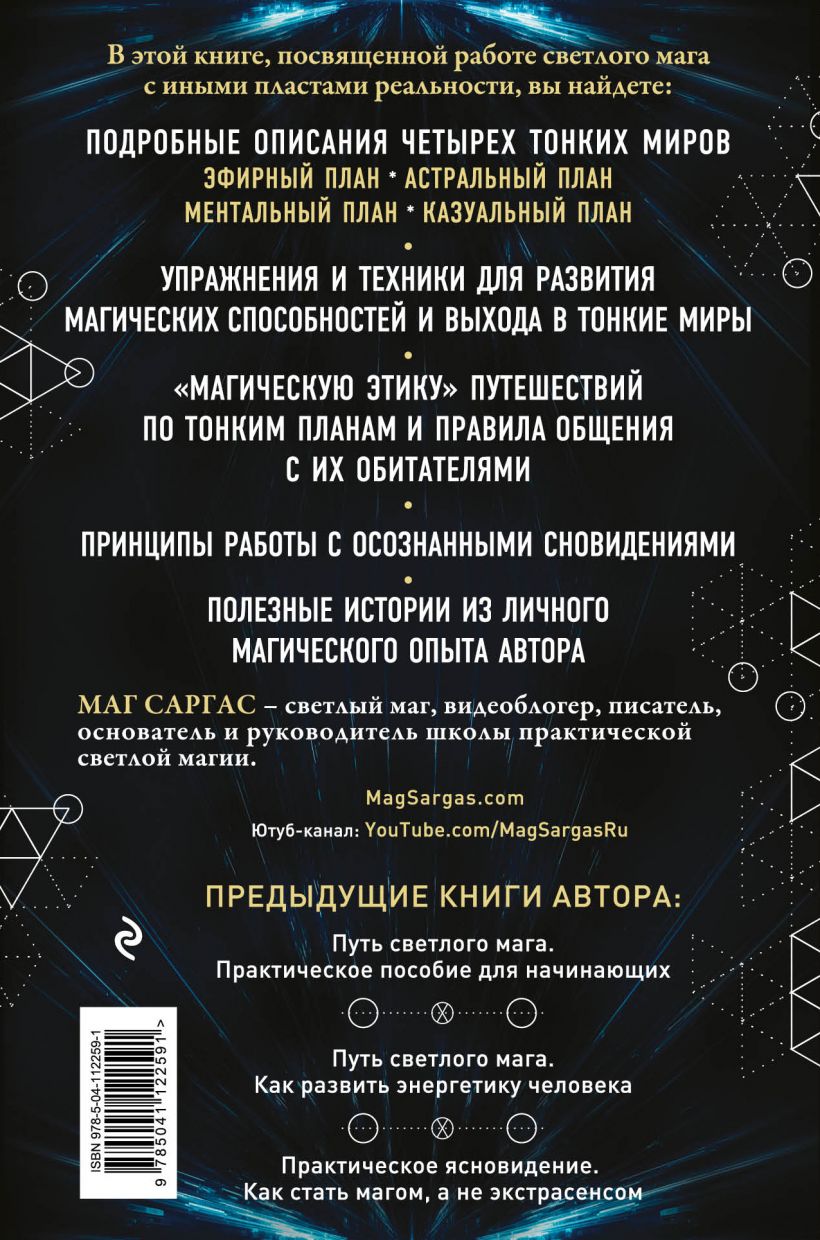 Маг всегда помнит: наш физический мир, знакомый и привычный,— не единственный. Есть и другие, параллельные слои реальности — тонкие планы или тонкие миры. По ним можно путешествовать, сними можно работать, открывая для себя новые иудивительные возможности. Обычный человек не в состоянии увидеть ипочувствовать их, однако тем, кто посвятил или собирается посвятить себя магическим искусствам, знание о том, что лежит за пределами обыденности, жизненно необходимо. Обо всем этом — новая книга Мага Саргаса, светлого мага, видеоблогера иписателя, посвященная тонким мирам, их устройству, многообразию и взаимодействию сними. С ее помощью вы узнаете, как получить доступ к иным планам реальности, избежать конфликтов сих обитателями и не навредить себе и другим. Атакже — сохранить физическое здоровье, разум идушу, подняв свою магическую практику на новый уровень. Эта книга — о мирах, которые лежат за пределами привычной нам физической реальности. По ним можно путешествовать, с ними можно работать, открывая для себя новые и удивительные возможности и развивая магические способности. О том, как научиться всему этому, рассказывает Маг Саргас — светлый маг, видеоблогер, писатель, основатель и руководитель школы практической светлой магии. В этой книге, посвященной работе с иными пластами реальности, вы найдете: • Подробные описания четырех тонких миров: эфирного, астрального, ментального и казуального. • Упражнения и техники для развития магических способностей и выхода в тонкие миры. • «Магическую этику» путешествий по тонким планам и общения с их обитателями. • Принципы работы с осознанными сновидениями. • Полезные истории из личного магического опыта автора.