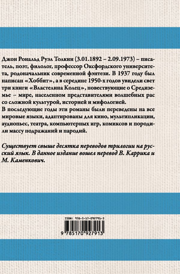 Джон Рональд Руэл Толкин (3.01.1892 – 2.09.1973) – писатель, поэт, филолог, профессор Оксфордского университета, родоначальник современной фэнтези. В 1937 году был написан "Хоббит", а в середине 1950-х годов увидели свет три книги "Властелина колец", повествующие о Средиземье – мире, населенном представителями волшебных рас со сложной культурой, историей и мифологией. Существует свыше десятка переводов трилогии на русский язык. В данное издание вошел перевод В. Каррика, М. Каменкович., Отличный перевод, он мог бы стать каноническим, но искажение имён героев книги и названий мест Средиземья (это очень сильно режет глаза), согласно рекомендации самого Толкина по переводу имён мешает ему стать таким. Хоть часть имён в этом переводе звучат как в оригинале, но не все. Господа переводчики, исправьте имена героев книги и названия мест Средиземья на оригинальные - это запутывает ориентир в книге. Заодно уберите, пожалуйста многословность, которую вы добавили в перевод и многочисленные комментарии - это его очень сильно портит. И хватит следовать рекомендации Д.Толкина по переводу имён, она уже излишняя.Отличный перевод, он мог бы стать каноническим, но искажение имён героев книги и названий мест Средиземья (это очень сильно режет глаза), согласно рекомендации самого Толкина по переводу имён мешает ему стать таким. Хоть часть имён в этом переводе звучат как в оригинале, но не все. Господа переводчики, исправьте имена героев книги и названия мест Средиземья на оригинальные - это запутывает ориентир в книге. Заодно уберите, пожалуйста многословность, которую вы добавили в перевод и многочисленные комментарии - это его очень сильно портит. И хватит следовать рекомендации Д.Толкина по переводу имён, она уже излишняя. Переводу ставлю пока оценку "4"., Отличный перевод, он мог бы стать каноническим, но искажение имён героев книги и названий мест Средиземья (эт�..., Очень понравилась эта книга, приятная на ощупь обложка, много приложений, но есть, как я считаю, одно "но", нет карты Средиземья. Иной раз хотелось открыть форзац и посмотреть на расположение некоторых мест, но каждый раз вспоминала, что там пусто., Очень понравилась эта книга, приятная на ощупь обложка, много приложений, но есть, как я считаю, одно "но", нет к...