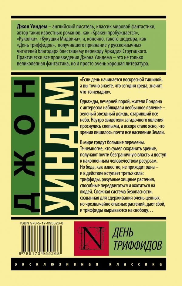«Казалосьбы, вот они, магазины илавки, без хозяев, без охраны, свитринами, забитыми едой; ивот оня, голодный исденьгами вкармане; иеслибы мне незахотелось платить, можно былобы разбить витрину ивзять, что угодно, бесплатно. Ноубедить себя пойти наэто было трудно. Прожив тридцать лет вуважении кправу ивповиновении закону, яеще небыл готов признать, что условия изменились совершенно»..., Легендарный научно‑фантастический роман Джона Уиндема повествует опростой истине: человечество очень уязвимо, если вовремя неразглядеть угрозу. Его мировое признание иллюстрирует большое количество экранизаций. Наиболее значимая изних— одноименный мини‑сериал Ника Копуса., Нарусский язык книгу в1966 году блестяще перевел Аркадий Стругацкий, что вомногом определило ееуспех вСССР. Текущее издание осталось верно традициям., «Если день начинается воскресной тишиной, авыточно знаете, что сегодня среда, значит, что‑то неладно»., Однажды, вечерней порой, жители Лондона синтересом наблюдали необычное явление— зеленый звездный дождь, озаривший все небо. Наутро свидетели загадочного явления проснулись слепыми, авскоре стало ясно, что зрения лишилось почти все население Земли., Вмире грядут большие перемены. Тенемногие, кто сумел сохранить зрение, получают почти безграничную власть идоступ кнакопленным человечеством ресурсам. Нобеда, как известно, неприходит одна— ивдействие вступает третья сила: триффиды, разумные хищные растения, способные передвигаться иохотиться налюдей. Сложная система безопасности, созданная для сдерживания очень ценных, ночрезвычайно опасных растений, дает сбой, итриффиды вырываются насвободу...