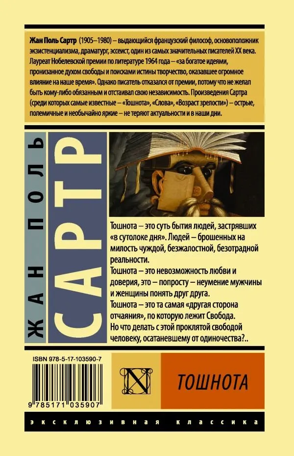 «Значит, это иесть свобода? Умоих ног понуро спускаются кгороду сады, ивкаждом саду— дом. Явижу море, тяжелое, неподвижное, явижу Бувиль. Погода стоит прекрасная. Ясвободен: вмоей жизни нет больше никакого смысла— всето, ради чего япробовал жить, рухнуло, аничего другого япридумать немогу. Яеще молод, уменя достаточно сил, чтобы начать сначала. Ночто начать?»..., Роман «Тошнота» стал одним изнаиболее известных произведений французского прозаика Жана Поля Сартра. Онбыл впервые опубликован в1938 году изатронул темы, которые станут основными втворчестве писателя: трагичности ибезысходности человеческой жизни, свободы иабсурдности бытия., «Тошнота»— это дневник главного героя, жителя вымышленного города Бувиль Антуана Рокантена. Онмучительно старается понять себя. Антуан побывал вомногих странах, где собирал материал для исторической книги, асейчас нигде неработает, ничем конкретным незаняти, всущности, свободен. Носвобода неприносит ему счастья— наоборот, для Рокантена это тяжелая ноша. Антуан почти нискем необщается иотделяет себя отживущей под властью инстинктов толпы..., Тошнота— это суть бытия людей, застрявших «всутолоке дня». Людей— брошенных намилость чуждой, безжалостной, безотрадной реальности., Тошнота— это невозможность любви идоверия, это— попросту— неумение мужчины иженщины понять друг друга., Тошнота— это тасамая «другая сторона отчаяния», покоторую лежит Свобода., Но— что делать сэтой проклятой свободой человеку, осатаневшему отодиночества?..