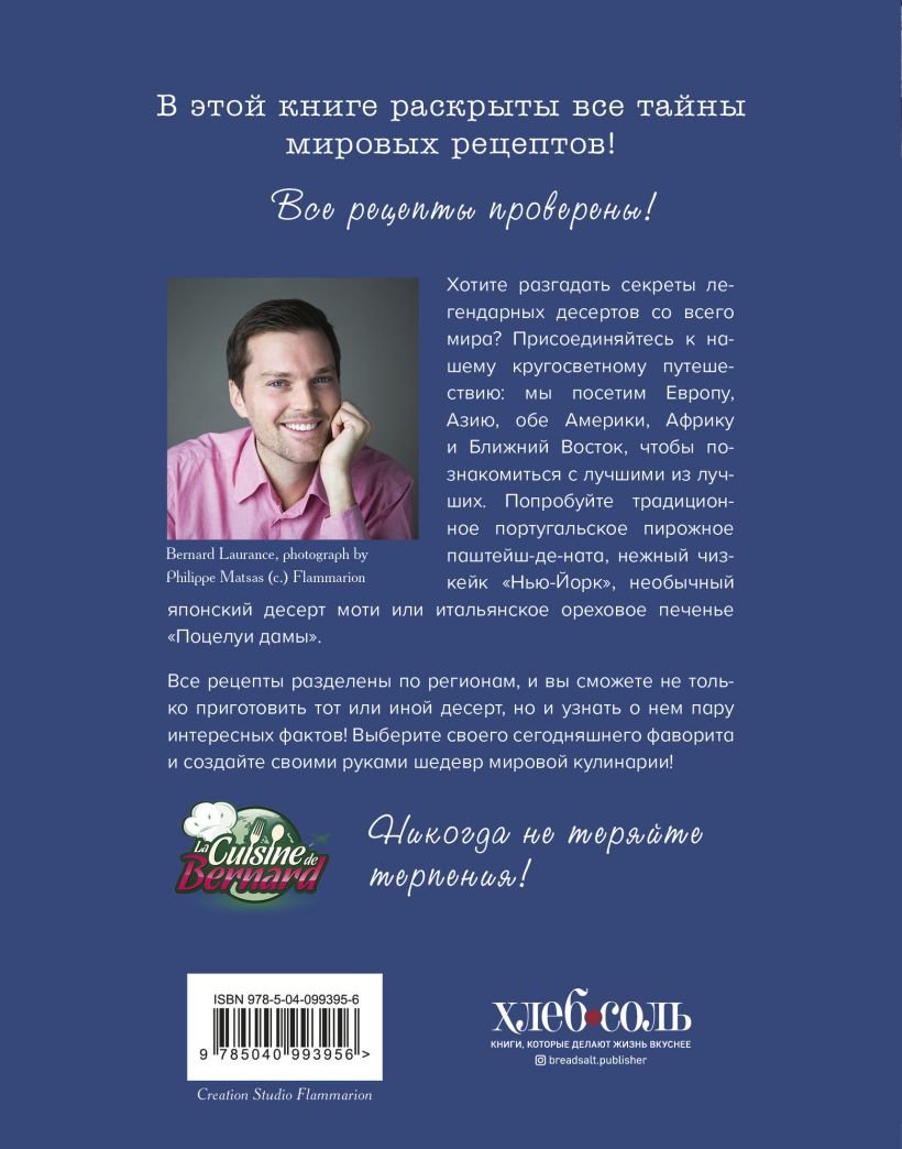 В путешествиях чаще всего запоминаются три вещи: места, люди и, конечно же, еда. И каждый раз, возвращаясь домой, нам хочется повторить те местные блюда, которые смогли очаровать нас и наши вкусы. Однако у таких рецептов могут быть свои особые секреты приготовления, и редко получается повторить их точь в точь. Бернард Лоранс потратил не один год, путешествуя и исследуя лучшие лакомства Европы, Азии, Ближнего Востока и Америки. Он пробовал вариации того или иного десертса, тщательно подбирал граммовки ингредиентов, беседовал с представителями разных культур, чтобы приготовить тот самое, настоящее пирожное или печенье, которые он попробовал первый и больше не смог забыть. С его книгой, в которой собрано более 100 разнообразных и приготовленных лично автором рецептов десертов, вы сможете устроить у себя на кухне настоящий кулинарный мировой тур. Если вас попросят назвать традиционные десерты разных стран, то что вы ответите? Наверняка у Франции это будет круассан, в Италии все только и думают, что о gellato, а в Турции — о рахат-лукуме. Но что вы скажете о печенье хаврефларн и канеле? Или пралине по-тайски? Никогда не слышали? Бернард Лоранс поможет вам устранить пробел в этих знаниях, а еще — расскажет, как готовить лучшие торты, печенья, пирожные и конфеты со всего света! В его книге вы найдете: — самые изысканные рецепты Америки, Европы, Индии, Японии и даже Океании; — секреты приготовления различных десертов, которые автор выведывал у коренных жителей разных стран, чьи семьи многими поколениями хранят их и передают только верному слушателю; — адаптированные рецепты для тех, кто считает себя профи в этом деле, и для тех, кто стоит первый раз у духовки, но жить не может и без кусочка сладкого. Изучайте мир, готовьте десерты и наслаждайтесь!