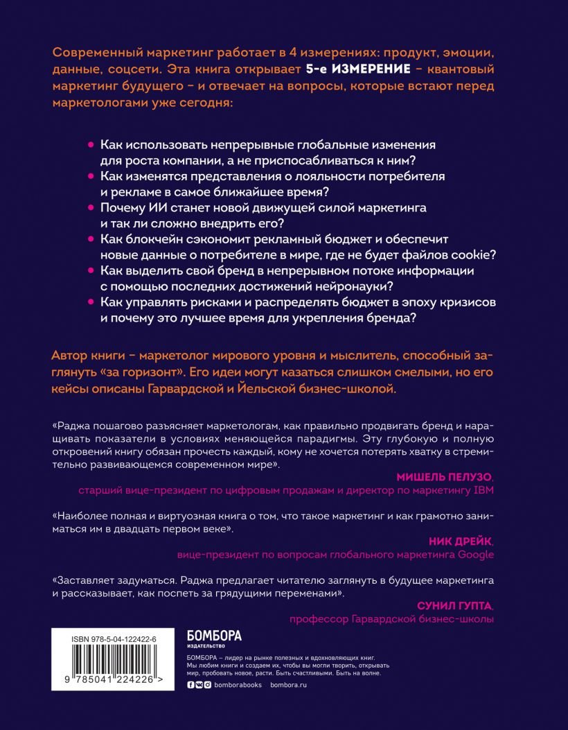 Мир меняется так стремительно, что большинство бизнес-стратегий устаревают еще на этапе разработки. Современный маркетинг работает в 4 измерениях: продукт, эмоции, данные, соцсети. Эта книга рассказывает о 5-м измерении – квантовом маркетинге будущего. Раджа Раджаманнар, директор по маркетингу и коммуникациям Mastercard, расскажет, как изменятся представления о лояльности потребителя и рекламе, как использовать последние достижения нейронауки, чтобы выделить свой бренд в непрерывном потоке информации, и почему ИИ станет новой движущей силой маркетинга. Современный маркетинг работает в 4-х измерениях: продукт, эмоции, данные, соцсети. Эта книга открывает 5-е измерение — квантовый маркетинг будущего — и отвечает на вопросы, которые встают перед маркетологами уже сегодня: • Как использовать непрерывные глобальные изменения для роста компании, а не приспосабливаться к ним. • Как изменятся представления о лояльности потребителя и рекламе в самое ближайшее время. • Почему ИИ станет новой движущей силой маркетинга и так ли сложно внедрить его. • Как блокчейн сэкономит рекламный бюджет и обеспечит новые данные о потребителе в мире, где не будет файлов cookie. • Как выделить свой бренд в непрерывном потоке информации с помощью последних достижений нейронауки. • Как управлять рисками и распределять бюджет в эпоху кризисов и почему это лучшее время для укрепления бренда. Автор книги — маркетолог мирового уровня и мыслитель, способный заглянуть «за горизонт». Его идеи могут казаться слишком смелыми, но его кейсы описаны Гарвардской и Йельской школами бизнеса. «Раджа пошагово разъясняет маркетологам, как правильно продвигать бренд и наращивать показатели в условиях меняющейся парадигмы. Эту глубокую и полную откровений книгу обязан прочесть каждый, кому не хочется потерять хватку в стремительно развивающемся современном мире». — Мишель Пелузо, старший вице-президент по цифровым продажам и директор по маркетингу IBM «Наиболее полная и виртуозная книга о том, что такое маркетинг и как грамотно заниматься им в двадцать первом веке». — Ник Дрейк, вице-президент по вопросам глобального маркетинга Google «Заставляет задуматься. Раджа предлагает читателю заглянуть в будущее маркетинга и рассказывает, как поспеть за грядущими переменами». — Сунил Гупта, профессор Гарвардской школы бизнеса