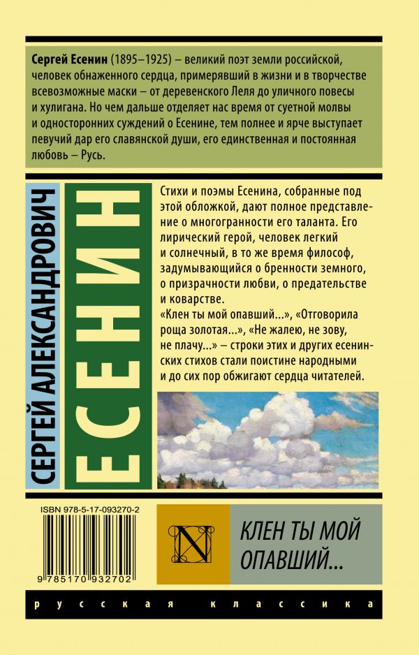 Отечественный писатель Максим Горький, Под обложкой сборника «Клен тымой опавший...»— лучшие стихотворения ипоэмы Сергея Есенина. Здесь итонкая лирика оприроде, религии илюбви изпервых сборников «Радуница», «Голубень», «Преображение», «Сельский часослов». Инадрывные стихи из«Исповеди хулигана», «Москвы кабацкой». Истремление осознать новую жизнь в«Стране советской». Иполные южного колорита «Персидские мотивы». Имногие другие известные стихи, невошедшие всборники. Среди них— «Клен тымой опавший, клен заледенелый...», «Письмо матери», «Мытеперь уходим понемногу...», «Негляди наменя супреком...», «Папиросники»., Также вкнигу включены три поэмы— «Анна Снегина» опосещении деревни вгоды Гражданской войны, изменившейся жизни инезабытой любви, «Поэма о36» озаключенных Шлиссельбургской крепости имучительная иоткровенная исповедь писателя «Черный человек»., Стихи Есенина всегда музыкальны. Недаром многие изних стали песнями висполнении Иосифа Кобзона иАркадия Северного, Евгения Мартынова иЗемфиры. Великий русский композитор Георгий Свиридов ивовсе написал настихотворения автора вокально‑симфоническую поэму., Стихи ипоэмы Есенина, собранные под этой обложкой, дают полное представление омногогранности его таланта. Его лирический герой, человек легкий исолнечный, втоже время философ, задумывающийся обренности земного, опризрачности любви, опредательстве иковарстве., «Клен тымой опавший...», «Отговорила роща золотая...», «Нежалею, незову, неплачу...»— строки этих идругих есенинских стихов стали поистине народными идосих пор обжигают сердца читателей.