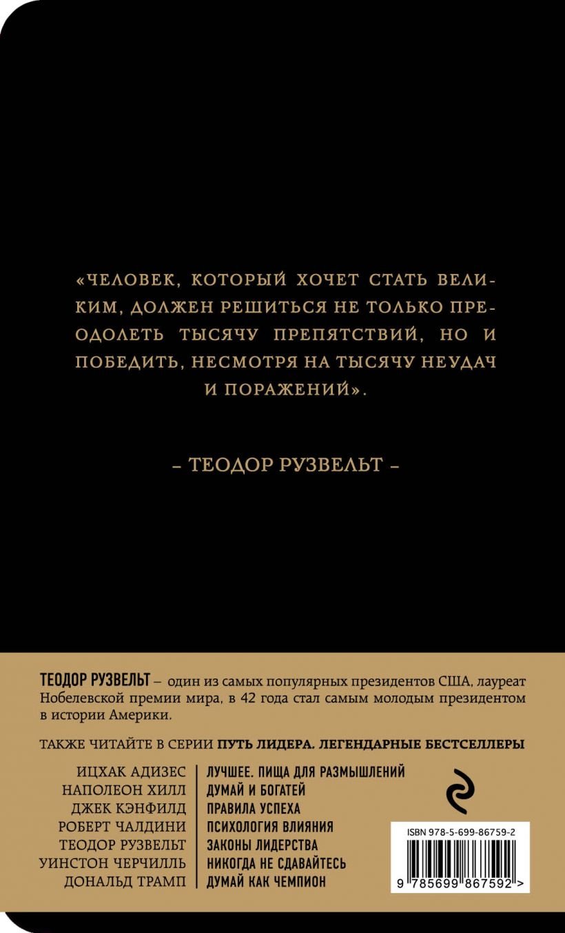 Теодор Рузвельт прошел путь от депутата законодательного собрания штата до президента Соединенных Штатов. Он выдвинул много смелых предложений, осуществил целый ряд непростых реформ в деятельности федерального правительства и при этом никогда не забывал, что служит народу Соединенных Штатов. И по сей день Теодор Рузвельт остается одним из самых популярных лидеров нации. В этой книге вы найдете 7 законов лидерства Рузвельта и 136 бесценных уроков, которые будут полезны современным лидерам и вдохновят их на новые успехи. Серия "Путь лидера. Легендарные бестселлеры" - это семь наиболее значимых в своей области книг о влиянии, управлении, стойкости, внутренней силе, богатстве, решительности и упорстве. Все авторы - признанные лидеры или лучшие эксперты по ключевым навыкам лидера. Эти бестселлеры уже имеют свою историю успеха и помогли миллионам людей добиться выдающихся результатов. Книги серии "Путь лидера. Легендарные бестселлеры" роскошно оформлены: переплет из черного бумвинила, тиснение золотом, скругленные углы, стильные красные форзацы и лента-ляссе, качественная белая бумага в блоке. Прекрасный подарок и украшение для книжной полки. О чем Теодор Рузвельт прошел путь от депутата законодательного собрания штата до президента Соединенных Штатов. Он выдвинул много смелых предложений, осуществил целый ряд непростых реформ в деятельности федерального правительства и при этом никогда не забывал, что служит народу Соединенных Штатов. И по сей день Теодор Рузвельт остается одним из самых популярных лидеров нации. Алан Аксельрод совершенно по-новому рассказывает об этом, казалось бы, всем известном человеке. Автор бестселлеров по истории, менеджменту и управлению бизнесом сформулировал 7 законов лидерства Рузвельта и изложил их в 136 бесценных уроках, которые будут полезны современным лидерам и вдохновят их на новые успехи. Для кого Для руководителей всех уровней, менеджеров, предпринимателей. Для тех, кто интересуется вопросами лидерства и историей. Фишки Законы лидерства подкреплены интересными фактами из жизни Теодора Рузвельта, его бессмертными высказываниями, а также комментариями автора, позволяющими применить эти законы в современных условиях. Книга хорошо структурирована, качественный перевод. Об авторе Алан Аксельрод - автор 80 книг по истории, управлению бизнесом и наукой, многие из которых стали бестселлерами. Доктор философии. Постоянный гость на телеканалах СNN, CNBC, Fox, MSNBC и на радио, в том числе и на NPR. Аксельрод и его книги упоминались в таких изданиях, как Fortune, Men’s Health и USA Today.