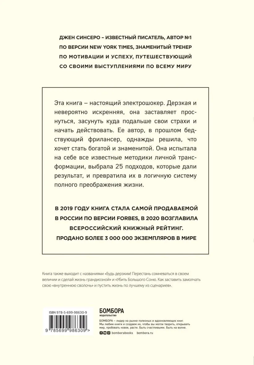 Хочешь жить так, как никогда не жил – начни делать то, что никогда не делал. Главная формула саморазвития, которую можно свести к "восточной мудрости" - НИ СЫ. Именно к этому призывает Джен Синсеро, автор культового бестселлера, вышедшего в 28 странах и проданного общим тиражом 1 000 000 экземпляров. Ее книга – это настоящий электрошокер. Она состоит из 25 самых действенных методик саморазвития, каждая из которых, будучи проверенной Джен Синсеро на собственном опыте, дала результат. Добавьте еще соленый авторский юмор, бесшабашную дерзость, подкупающую самоиронию и получите самую мощную из существующих книг по преображению жизни. Если что-то и может заставить вас по максимуму реализовать свой потенциал, это она – невероятная, яркая, прорывная книга Джен Синсеро. Также выходит под названиями "Убить Большого Соню. Как заставить замолчать свою "внутреннюю сволочь" и направить жизнь по лучшему из сценариев" и "Будь дерзким! Как перестать сомневаться в собственном величии и сделать жизнь грандиозной".Книга полна грубоватых и прикольных советов по работе над своим Я. Она объясняет, как заставить замолчать внутреннего критика и начать строить жизнь, достойную новостной ленты Facebook… Bustle.com Книга написана живым, цепким языком и изобилует юмором. Publishers Weekly Если вы ищете волшебную пилюлю от всех проблем, в этой книги ее нет. Зато есть практичные и простые способы договориться со своим внутренним «крутым парнем» и изменить жизнь к лучшему. Мэдисон Тейлор, основатель DailyOM Джен Синеро, автор и тренер по лидерству, со свойственным ей юмором и неповторимым стилем поднимает тему самосовершенствования на новый уровень. Weekly Alibi Синсеро, вероятно, написала лучшую из книг по саморазвитию, которую многие читатели когда-либо держали в руках... The State Hornet, газета Калифорнийского государственного университета, штата Сакраменто Эта книга по саморазвитию для людей, которые отчаянно хотят улучшить свою жизнь и при этом не попасть за решетку. MindBodyGreen Просто шедевр! Лисл Фройнденштайн, Boulder