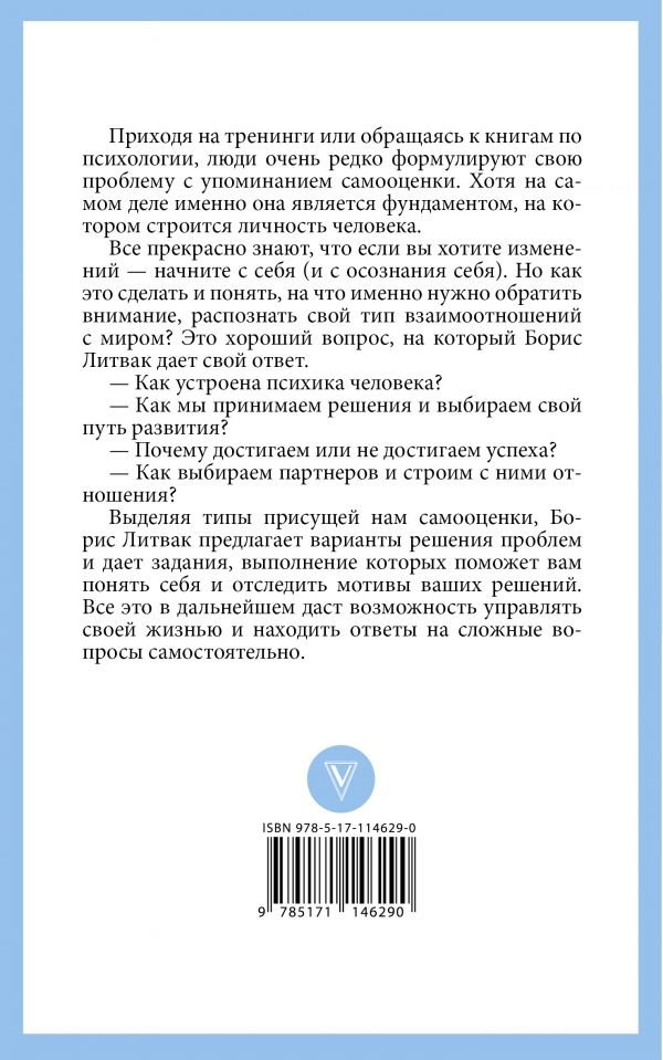 Борис Литвак— бизнесмен ибизнес‑тренер, директор клуба КРОСС, создатель авторских программ «Новый уровень мышления», «Фундамент Цели», «Роли вгруппе», «Сценарное перепрограммирование», программ посаморазвитию исамооценке., Приходя натренинги или обращаясь ккнигам попсихологии, люди очень редко формулируют свою проблему супоминанием самооценки. Хотя насамом деле именно она является фундаментом, накотором строится личность человека., Все прекрасно знают, что если выхотите изменений— начните ссебя (исосознания себя). Нокак это сделать ипонять, начто именно нужно обратить внимание, распознать свой тип взаимоотношений смиром? Это хороший вопрос, накоторый Борис Литвак дает свой ответ., Выделяя типы присущей нам самооценки, Борис Литвак предлагает варианты решения проблем идает задания, выполнение которых поможет вам понять себя иотследить мотивы ваших решений. Все это вдальнейшем даст возможность управлять своей жизнью инаходить ответы насложные вопросы самостоятельно., Полина Котляренко, LiveLib.ru, «Яперечитала немало книг посаморазвитию иуже привыкла кстандартным наборам идей иупражнений, которые дают авторы, идаже кшаблонам повествования. Нокогда книга пишется помотивам собственного опыта, она автоматически перестает быть „очередной копией“. АуБориса Литвака опыт солидный— опыт профессионального врача, психолога ибизнесмена, что, безусловно, уменя вызывает уважение идоверие., Автор дает читателю инструкцию повыявлению тех базовых установок, которые расшатывают его самооценку... Методика ихвыявления— самое интересное вкниге. Описывать небуду, скажу только, что яосебе узнала много нового, иэто было полезно»., Ксения Емельянова, LiveLib.ru