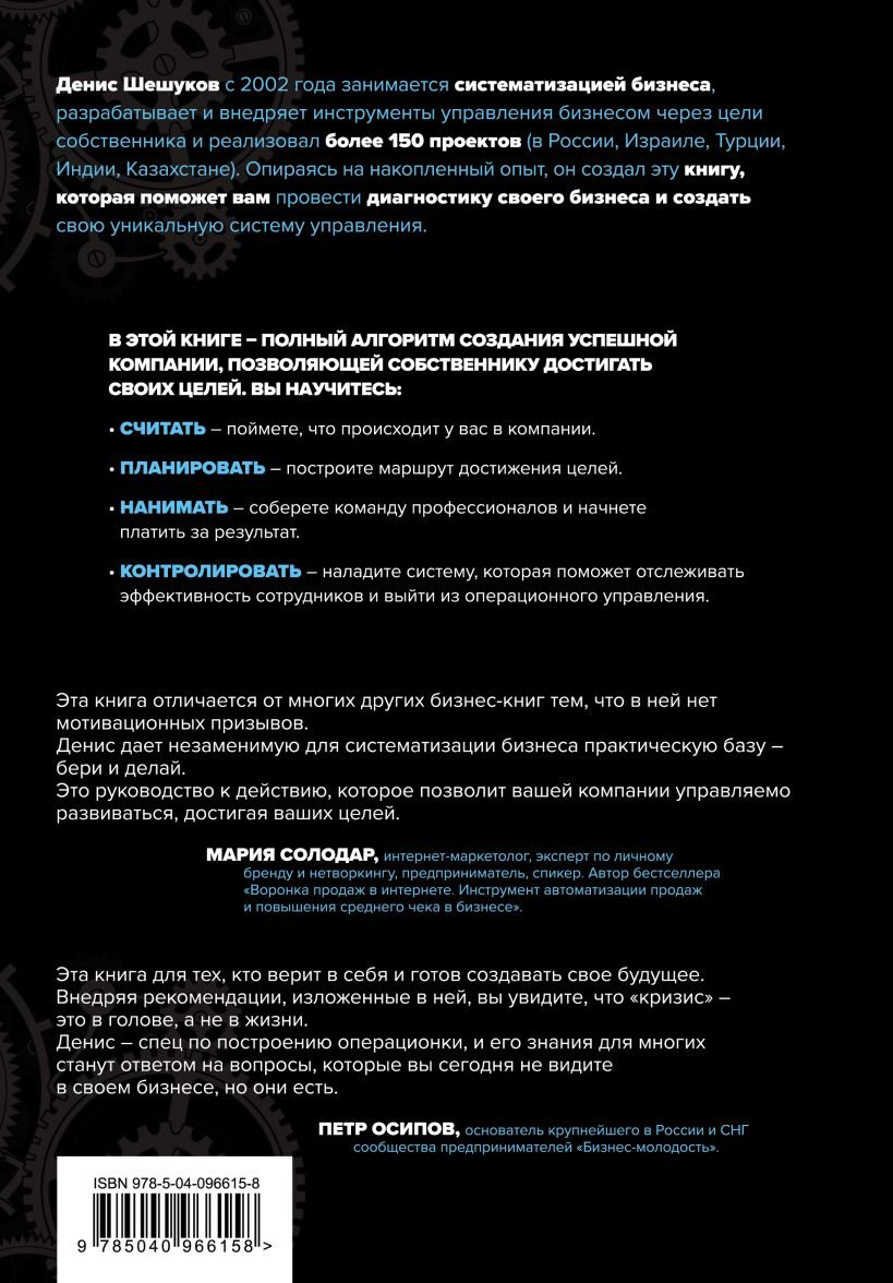 Денис Шешуков с 2002 года занимается систематизацией бизнеса, разрабатывает и внедряет инструменты управления бизнесом через цели собственника и реализовал более 150 проектов (в России, Израиле, Турции, Индии, Казахстане). Опираясь на накопленный опыт, он создал эту книгу, которая поможет вам провести диагностику своего бизнеса и создать свою уникальную систему управления. Эта книга точно нужна вам, если вы: • постоянно находитесь в аврале, решаете проблемы и исправляете чужие ошибки; • не понимаете, как выйти на новый уровень дохода; • живете от одного кассового разрыва до следующего; • не знаете, чем занимаются ваши сотрудники; • устали сражаться за выживание своего бизнеса. В этой книге — полный алгоритм создания успешной компании, позволяющей собственнику достигать своих целей. Вы научитесь: • Считать — поймете, что происходит у вас в компании. • Планировать — построите маршрут достижения целей. • Нанимать — соберете команду профессионалов и начнете платить за результат. • Контролировать — наладите систему, которая позволит отслеживать эффективность сотрудников и выйти из операционного управления. Эта книга — практика нового мышления собственника, ведущая на высшую ступень эволюции бизнеса. «Эта книга отличается от многих других бизнес-книг тем, что в ней нет мотивационных призывов. Денис дает незаменимую для систематизации бизнеса практическую базу — бери и делай. Это руководство к действию, которое позволит вашей компании управляемо развиваться, достигая ваших целей». — Мария Солодар «Эта книга для тех, кто верит в себя и готов создавать свое будущее. Внедряя рекомендации, изложенные в ней, вы увидите, что «кризис» это в голове, а не в жизни. Денис — спец по построению операционки, и его знания для многих станут ответом на вопросы, которые вы сегодня не видите в своем бизнесе, но они есть». — Пётр Осипов