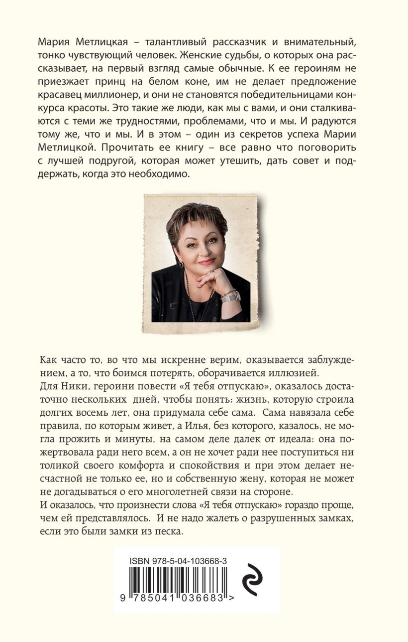 «Я тебя отпускаю» - это две житейские истории, увлекательные и искренние, написанные в характерном стиле писательницы. Автор спокойно, без театральных пауз и дешёвых эффектов представляет читателям своих героинь. У незлобивой, восторженной, лёгкой Ники многолетняя связь с женатым мужчиной. Рина Александровна – злопамятная, жёсткая, острая на язык, прицельно развешивающая ярлыки, уверенная, что знает всё и про себя, и про других. Две очень разные героини похожи в одном: обе убедили себя, что всё уже сложилось. Что они сами сотворили эту жизнь, на которую внешним обстоятельствам уже не повлиять. И, конечно, обе ошибаются. В любую минуту всё может изменится. Главное, решить для себя, как ты принимаешь случившееся. И принимаешь ли. «Бабы – они сильные. Бей наотмашь – все равно поднимутся. Покачнутся, а поднимутся. Распластаются, размажутся по полу, а потом соберутся, вытрут сопли, заплетут косы – и вперед». Мария Метлицкая не заканчивает свои истории сказочным финалом про «жили долго и счастливо и умерли в один день». Но она даёт своим героиням – а значит, и читательницам – надежду: пока мы живы, всё можно изменить. Смогут ли Ника и Рина принять правильные решения и отделить зёрна от плевел – читайте в новой книге Марии Метлицкой «Я тебя отпускаю». Как часто то, во что мы искренне верим, оказывается заблуждением, а то, что боимся потерять, оборачивается иллюзией. Для Ники, героини повести "Я тебя отпускаю" оказалось достаточно нескольких дней, чтобы понять: жизнь, которую она строила долгих восемь лет, она придумала себе сама. Сама навязала себе правила, по которым живет, а Илья, без которого, казалось, не могла прожить и минуты, на самом деле далек от идеала: она пожертвовала ради него всем, а он не хочет ради нее поступиться ни толикой своего комфорта и спокойствия и при этом делает несчастной не только ее, но и собственную жену, которая не может не догадываться о его многолетней связи на стороне. И оказалось, что произнести слова "Я тебя отпускаю" гораздо проще, чем ей представлялось. И не надо жалеть о разрушенных замках, если это были замки из песка.