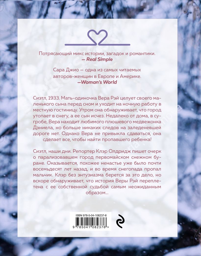 Сиэтл, 1933. Мать-одиночка Вера Рэй целует своего маленького сына перед сном и уходит на ночную работу в местную гостиницу. Утром она обнаруживает, что город утопает в снегу, а ее сын исчез. Недалеко от дома, в сугробе, Вера находит любимого плюшевого медвежонка Дэниела, но больше никаких следов на заледеневшей дороге нет. Однако Вера не привыкла сдаваться, она сделает все, чтобы найти пропавшего ребенка! Сиэтл, наши дни. Репортер Клэр Олдридж пишет очерк о парализовавшем город первомайском снежном буране. Оказывается, похожее ненастье уже было почти восемьдесят лет назад, и во время снегопада пропал мальчик. Клэр без энтузиазма берется за это дело, но вскоре обнаруживает, что история Веры Рэй переплетена с ее собственной судьбой самым неожиданным образом... «Ежевичная зима» — психологическая драма с историческими экскурсами и неожиданными сюжетными коллизиями. Это роман-лабиринт, связывающий 1933 год и наши дни. Главная героиня книги оказывается в центре хитросплетения эпох и семейных историй. Идеальная история для поклонников тонких психологических драм, историй с харизматичными персонажами и непредсказуемыми поворотами сюжета. Сиэтл, 1933. Мать-одиночка Вера Рэй целует своего маленького сына перед сном и уходит на ночную работу в местную гостиницу. Утром она обнаруживает, что город утопает в снегу, а ее сын исчез. Недалеко от дома, в сугробе, Вера находит любимого плюшевого медвежонка Дэниела, но больше никаких следов на заледеневшей дороге нет. Однако Вера не привыкла сдаваться, она сделает все, чтобы найти пропавшего ребенка! Сиэтл, наши дни. Репортер Клэр Олдридж пишет очерк о парализовавшем город первомайском снежном буране. Оказывается, похожее ненастье уже было почти восемьдесят лет назад, и во время снегопада пропал мальчик. Клэр без энтузиазма берется за это дело, но вскоре обнаруживает, что история Веры Рэй переплетена с ее собственной судьбой самым неожиданным образом... «Потрясающий микс истории, загадок и романтики». — Real Simple «Сара Джио — одна из самых читаемых авторов-женщин в Европе и Америке». — Woman’s World
