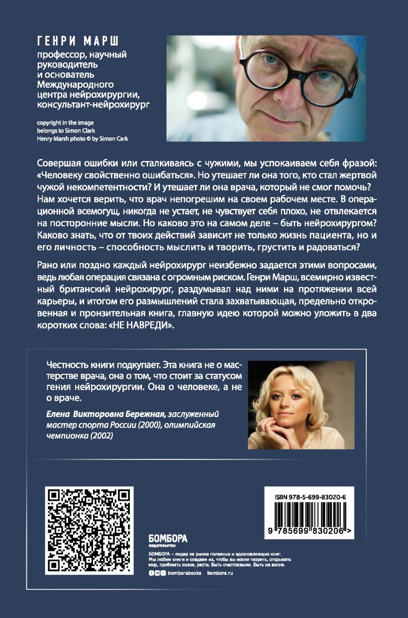 Совершая ошибки или сталкиваясь с чужими, мы успокаиваем себя фразами вроде "Человеку свойственно ошибаться". Но утешают ли они того, кто стал жертвой чужой некомпетентности? И утешают ли они врача, который не смог помочь? Нам хочется верить, что врач непогрешим на своем рабочем месте. В операционной всемогущ, никогда не устает и не чувствует себя плохо, не раздражается и не отвлекается на посторонние мысли. Но каково это на самом деле — быть нейрохирургом? Каково знать, что от твоих действий зависит не только жизнь пациента, но и его личность — способность мыслить и творить, грустить и радоваться? Рано или поздно каждый нейрохирург неизбежно задается этими вопросами, ведь любая операция связана с огромным риском. Генри Марш, всемирно известный британский нейрохирург, раздумывал над ними на протяжении всей карьеры, и итогом его размышлений стала захватывающая, предельно откровенная и пронзительная книга, главную идею которой можно уложить в два коротких слова: "не навреди".Об авторе: Генри Марш – всемирно известный британский ПРАКТИКУЮЩИЙ нейрохирург, оперирует пациентов с наиболее тяжелыми случаями. Профессор, научный руководитель и основатель Международного центра нейрохирургии на Украине (Киев), совместно с Игорем Курельцом. Особенности книги: • Переведена на 17 языков! • вошла в список бестселлеров New York Times, становилась лауреатом или попадала в шортлист нескольких премий! • в 2007 году вышел документальный фильм «Английский хирург», в котором мы можем наблюдать за работой Генри Марша во время проведения настоящей операции. О чем эта книга: Книга – о буднях нейрохирурга, его работе, его выборе, за кого из пациентов бороться, а кого отпустить. Конечно, не хотелось бы попасть к нему на прием, но иногда это случается. И хочется, чтобы врач делал свою работу хорошо. Но все мы забываем, что нейрохирурги тоже люди, со своими заботами, обидами, недосыпом… головной болью, наконец. Каково это – быть ответственным за жизнь и здоровье человека? Где черпают силы люди, от которых зависит так много? Продолжающаяся серия «Медицина без границ». Книги о тех, кто спасает жизни! – книги о работе медперсонала.