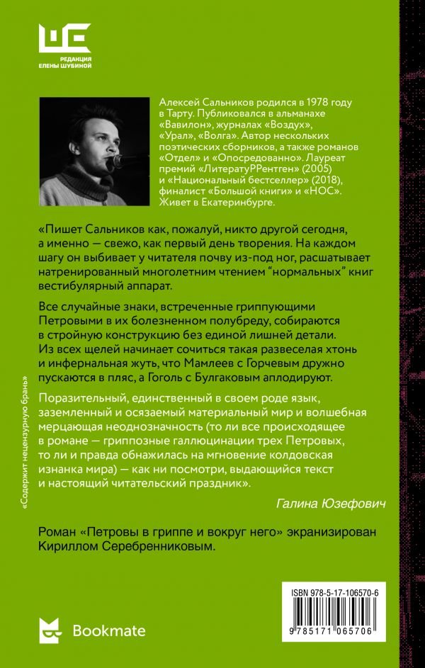 Алексей Сальников родился в1978 году вТарту. Публиковался вальманахе «Вавилон», журналах «Воздух», «Урал», «Волга». Автор трех поэтических сборников. Лауреат премий «ЛитератуРРентген» (2005) и«Национальный бестселлер (2018), финалист «Большой книги» и«НОС». Живет вЕкатеринбурге., Все случайные знаки, встреченные гриппующими Петровыми вихболезненном полубреду, собираются встройную конструкцию без единой лишней детали. Извсех щелей начинает сочиться такая развеселая хтонь иинфернальная жуть, что Мамлеев сГорчевым дружно пускаются впляс, аГоголь сБулгаковым аплодируют., Поразительный, единственный всвоем роде язык, заземленный иосязаемый материальный мир ипо‑настоящему волшебная мерцающая неоднозначность (толи все происходящее вромане— гриппозные галлюцинации трех Петровых, толи иправда обнажилась намгновение колдовская изнанка мира)— как нипосмотри, выдающийся текст инастоящий читательский праздник»., Галина Юзефович, Когда-то я жила в Екатеринбурге, работала там, и навсегда увезла с собой и это протяжное "о", и эту речку-замерзайку, будто вросший в нее Оперный театр, лето, которое тем прекрасно, что долгожданно и коротко... в общем, на роман воспоминаний может и не хватит, но поддержать разговор - всегда) Читая про Петрова, колесящего по знакомому городу с его Уралмашем, было и узнаваемо, и как-то по-свойски. Так же по-свойски у автора и всё остальное - будничные мысли, перерастающие в не очень будничные дела. Всполохи и метания. Куролесица или околесица? Все насквозь какое-то русское, бредовое, не понятное, и, как говорит уже название романа "гриппозное", что ли. Петрова по жизни несёт. Как и многих. Попробуй спланируй в России жизнь? Вот. То-то и оно. Всегда найдется Игорь на катафалке, где-то позади твоего троллейбуса. И можно под настроение посчитать, что будни Петрова чернушные, и всё вокруг беспросветно, а можно, под другое, это уж как вам повезет, наоборот, увидеть за витиеватостью стиля-слога автора не только беспросветность, бытовуху, а и чудеса. Ну, такие, тоже русские, народные. Не дублинские, хотя, или это просто Блумсдэй был на днях, чем не уральский Леопольд? А может вы и еще что разглядите., Когда-то я жила в Екатеринбурге, работала там, и навсегда увезла с собой и это протяжное "о", и эту речку-замерз�..., Прежде всего хочу написать об авторе романа - он живет в Екатеринбурге, где и происходит действие романа , стал известным и популярным после него. Главные герои - Петров - отец механик в автосервисе , мать - библиотекарь и их школьник- сын . Они разведены , но живут вместе в одной квартире . И как многие зимой болеют гриппом . Само повествование романа - несколько дней из жизни этой семьи . Язык книги живой , понятный всем . Роман по моему мнению неоднозначный , но его обязательно стоит прочитать , чтобы составить свое мнение ,тем более , что он до сих пор активно обсуждается на интернет площадках., Прежде всего хочу написать об авторе романа - он живет в Екатеринбурге, где и происходит действие романа , ста�..., Гениальное произведение. Очень многослойное. При своей простоте, книга даёт очень много размышлений. Неожиданные повороты. Само построение сюжета больше похоже на грипозный бред. Советую всем!, Гениальное произведение. Очень многослойное. При своей простоте, книга даёт очень много размышлений. Неожида...