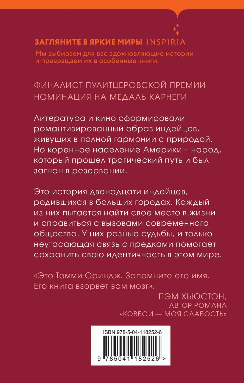 Литература и кино сформировали романтизированный образ индейцев, живущих в полной гармонии с природой. Но коренное население Америки – народ, который прошел трагический путь и был загнан в резервации. Это история двенадцати индейцев, родившихся в больших городах. Каждый из них пытается найти свое место в жизни и справиться с вызовами современного общества. У них разные судьбы, и только неугасающая связь с предками помогает сохранить свою идентичность в этом мире. Бестселлер The New York Times. Финалист Пулитцеровской премии. Победитель National Book Critics Circle Award's. Победитель Hemingway Foundation/PEN Award. Номинация на Медаль Карнеги. Номинация на National Book Award. Книга года по версии журналов The Washington Post, NPR, Time, O, The Oprah Magazine, San Francisco Chronicle, Entertainment Weekly, The Boston Globe, GQ, The Dallas Morning News, Buzzfeed, BookPage, Publishers Weekly, Library Journal, Kirkus Reviews. «Потрясающий литературный дебют». — Маргарет Этвуд «Роман Томми Оринджа открывает для нас не только нового автора, но и целый мир, в котором трагическая история коренных народов Северной Америки отзывается в судьбах их потомков, нынешних городских индейцев. И это совсем не те «краснокожие» из полюбившихся нам вестернов. Незримая нить прошлого связывает двенадцать персонажей, каждый из которых отчаянно ищет свое место на этой земле и отстаивает свою идентичность. Неспешное повествование постепенно набирает обороты и приводит к драматической кульминации, и тут в полной мере проявляется мастерство автора, сумевшего зацепить читателя, заставить его проникнуться атмосферой «индейскости» и переживать вместе с героями». — Ирина Литвинова, переводчик «Это Томми Ориндж. Запомните его имя. Его книга взорвет вам мозг». — Пэм Хьюстон, автор романа «Ковбои — моя слабость»