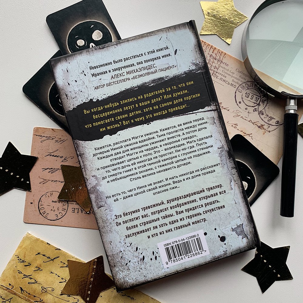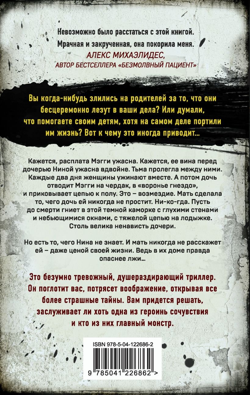 Вы когда-нибудь злились на родителей за то, что они бесцеремонно лезут в ваши дела? Или думали, что помогаете своим детям, хотя на самом деле портили им жизнь? Вот к чему это иногда приводит… Кажется, расплата Мэгги – ужасна. Кажется, ее вина перед дочерью Ниной – ужасна вдвойне. Тьма пролегла между ними. Каждые два дня женщины ужинают вместе. А потом дочь отводит Мэгги на чердак, в "воронье гнездо", и приковывает цепью к полу. Это – возмездие. Мать сделала то, чего дочь ей никогда не простит. Ни-ко-гда. Пусть до смерти гниет в этой темной каморке с глухими стенами и небьющимися окнами, с тяжелой цепью на лодыжке. Столь велика ненависть дочери. Но есть то, чего Нина не знает. И мать никогда не расскажет ей – даже ценой своей жизни. Ведь в их доме правда опаснее лжи… От автора бестселлера «ЕДИНСТВЕННЫЙ». Роман-лауреат премии International Thriller Writers Awards. Вы когда-нибудь злились на родителей за то, что они бесцеремонно лезут в ваши дела? Или думали, что помогаете своим детям, хотя на самом деле портили им жизнь? Вот к чему это иногда приводит… Кажется, расплата Мэгги — ужасна. Кажется, ее вина перед дочерью Ниной — ужасна вдвойне. Тьма пролегла между ними. Каждые два дня женщины ужинают вместе. А потом дочь отводит Мэгги на чердак, в «воронье гнездо», и приковывает цепью к полу. Это — возмездие. Мать сделала то, чего дочь ей никогда не простит. Ни-ко-гда. Пусть до смерти гниет в этой темной каморке с глухими стенами и небьющимися окнами, с тяжелой цепью на лодыжке. Столь велика ненависть дочери. Но есть то, чего Нина не знает. И мать никогда не расскажет ей — даже ценой своей жизни. Ведь в их доме правда опаснее лжи… Это безумно тревожный, душераздирающий триллер. Он поглотит вас, потрясет воображение, открывая все более страшные тайны. Вам придется решать, заслуживает ли хоть одна из героинь сочувствия и кто из них главный монстр. «Невозможно было расстаться с этой книгой. Мрачная и закрученная, она покорила меня». — Алекс Михаэлидес, автор бестселлера «Безмолвный пациент» «Самый зловещий из романов Маррса на сегодня». — Daily Express «Мрачный, напряженный психологический триллер высочайшего класса». — My Weekly «Блестящий замысел и мастерское владение искусством шокирующих поворотов». — Клэр Макгоуэн «Я очарована этим романом, хотя, думаю, не читала ничего мрачнее. Ничего». — Сюзи Холлидэй