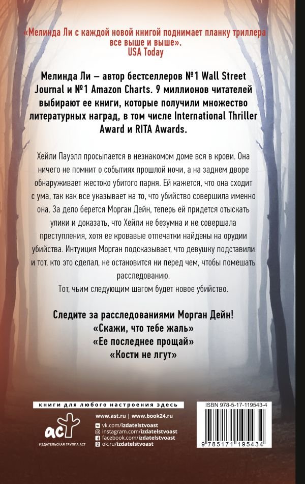 Четвертая книга всерии обадвокате Морган Дейн. Она берется защищать новую жертву чьей‑то безжалостной игры. Наэтот раз вбеду попала Хейли Пауэлл. Еёотпечатки найдены наорудии убийства инаизувеченном трупе. Удевушки нет ниалиби, нивоспоминаний опрошедшей ночи. Она пришла всебя внезнакомом доме вследах чьей‑то крови, аназаднем дворе нашла убитого мужчину. Морган вновь рискует своей жизнью, чтобы докопаться доправды. Споиском улик ейпомогает частный детектив Ланс Крюгер, скоторым она состоит вромантических отношениях. Каждая книга Мелинда Лиувлекательна иинтересна без привязки кпредыдущим событиям детективного цикла. Автору неизменно удается придумать новое таинственное преступление иводить занос как героев, так ичитателей. Книга читается легко ибыстро, особенно когда теряешься вдогадках, раздумывая: «Ктоже настоящий убийца?», Мелинда Ли— автор бестселлеров №1Wall Street Journal и №1Amazon Charts. 9миллионов читателей выбирают еекниги, которые получили множество литературных наград, вчисле которых International Thriller Award иRITA Awards., Хейли Пауэлл просыпается внезнакомом доме, вся вкрови. Она ничего непомнит особытиях прошлой ночи, аназаднем дворе обнаруживает жестоко убитого парня. Ейкажется, что она сходит сума, так как все указывает нато, что убийство совершила именно она., Задело берется Морган Дейн, теперь ейпридется отыскать улики идоказать, что Хейли небезумна инесовершала преступления, хотя еекровавые отпечатки найдены наорудии убийства. Интуиция Морган подсказывает, что девушку подставили, итот, кто это сделал неостановится ниперед чем, чтобы помешать расследованию. Тот, чьим следующим шагом будет новое убийство., Следите зарасследованиями Морган Дейн! «Скажи, что тебе жаль» «Еепоследнее прощай» «Кости нелгут»