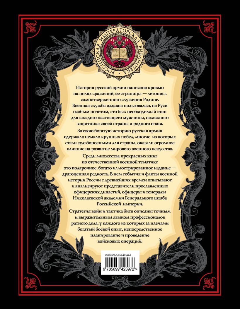 История русской армии написана кровью на полях сражений, ее страницы — летопись самоотверженного служения Родине. Военная служба издавна пользовалась на Руси особым почетом, это был необходимый этап для каждого настоящего мужчины, надежного защитника своей страны и родного очага. За свою богатую историю русская армия одержала немало крупных побед, многие из которых стали судьбоносными для страны, оказали огромное влияние на развитие мирового военного искусства. Среди множества прекрасных книг по отечественной военной тематике это подарочное, богато иллюстрированное издание — драгоценная редкость. В нем события и факты военной истории России с древнейших времен анализируют представители прославленных офицерских династий Российской империи, офицеры и генералы Николаевской академии Генерального штаба. Стратегия войн и тактика битв описаны точным и выразительным языком профессионалов ратного дела, у каждого из которых за плечами богатый боевой опыт, непосредственное планирование и проведение войсковых операций. Издание сопровождается редкими иллюстрациями материалом, подробными картами и обширным авторскими комментариями. О серии Серия «Российская императорская библиотека» — это грандиозное собрание выдающихся образцов отечественной мысли и словесности. Издания, вошедшие в серию, представляют собой лучшее в великом духовном наследии нашей страны. Это труды, созданные знаменитыми историками, учеными, великими государственными деятелями и посвященные тысячелетней истории России, ее культуре и искусству, военной славе, многовековым народным обычаям и деяниям выдающихся представителей нашего Отечества. Прекрасная возможность составить свою домашнюю библиотеку из великих трудов о великой стране. Каждая книга серии прекрасно проиллюстрирована многочисленными цветными и черно-белыми иллюстрациями, которые дают возможность в полном объеме увидеть то, что составляет сокровищницу культурного наследия нашей страны! Для кого эта серия Каждая книга серии станет великолепным подарком: - для тех, кто собирает домашнюю библиотеку классических трудов; - для тех, кто интересуется историей России, выдающимися личностями; - для школьников и студентов. Об этой книге В этом томе серии «Российская императорская библиотека» события и факты военной истории России с древнейших времен анализируют представители прославленных офицерских династий Российской империи, офицеры и генералы Николаевской академии Генерального штаба. Стратегия войн и тактика битв описана точным и выразительным языком профессионалов ратного дела, у каждого из которых за плечами богатый боевой опыт, непосредственное планирование и проведение войсковых операций. Издание сопровождается редкими иллюстрациями, материалом, подробными картами и обширными авторскими комментариями. Фрагмент «Императору Александру прежде всего предстояло решить вопрос: где встретить неприятеля — на чужой земле или в своих пределах? Действуя наступательно, мы избавляли свою страну от тягости войны, могли усилиться войсками и средствами Пруссии и поднять всю Германию, изнемогавшую под игом Наполеона и покрытую сетью тайных обществ. Но для этого нужно было довериться полякам, что было невозможно, так как поляки поспешили провозгласить в Варшаве восстановление П