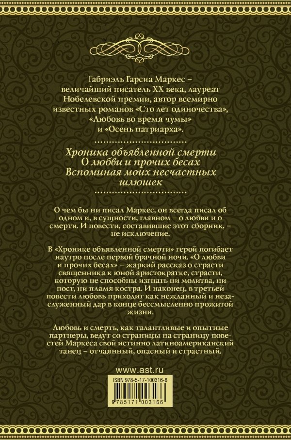 О чем бы ни писал Маркес, он всегда писал об одном и, в сущности, главном – о любви и о смерти. И повести, составившие этот сборник – не исключение. В "Хронике объявленной смерти" герой погибает наутро после первой брачной ночи. "О любви и прочих бесах" – жаркий рассказ о страсти священника к юной аристократке – страсти, которую не способны изгнать ни молитва, ни пост, ни пламя костра. И наконец в третьей повести любовь приходит как нежданный и незаслуженный дар в конце бессмысленно прожитой жизни. Любовь и смерть, как талантливые и опытные партнеры, ведут со страницы на страницу повестей Маркеса свой истинно латиноамериканский танец – отчаянный, опасный и страстный., Любовь и смерть - бесспорно, главные темы, к которым Габриэль Гарсия Маркес обращается практически во всех своих произведениях. В этом сборнике собраны три повести Маркеса, в которых обе эти темы ведут читателя по страницам, словно опытные партнеры в страстном латиноамериканском танго. Хроника объявленной смерти - повествует об убийстве Сантьяго Назара близнецами Пабло и Педро Викарио. История рассказывается от лица лучшего друга убитого. Он вернулся в родной город спустя много лет, чтобы узнать, что толкнуло братьев на совершение страшного преступления. О любви и прочих бесах. Когда молоденькую баронессу Марию назвали одержимой и заключили в монастырь – спасать ее несчастную душу было поручено юному священнику. Что было дальше, вы, наверное, догадываетесь... Воспоминая моих несчастных шлюшек – в 2004 году Габриэль Гарсия Маркес, после двадцатилетнего перерыва, снова берется за перо и пишет свою последнюю повесть. Это история о девяностолетнем старике, впервые в жизни испытавшем любовь. Повесть представляет собой наглядную иллюстрацию старинного изречения, согласно которому – любви все возрасты покорны., ▼ Читать отрывок ▼