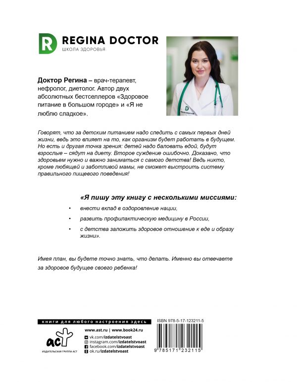 Доктор Регина— врач‑терапевт, нефролог, диетолог. Автор двух абсолютных бестселлеров «Здоровое питание вбольшом городе» и«Янелюблю сладкое»., Говорят, что задетским питанием надо следить ссамых первых дней жизни, ведь это влияет нато, как организм будет работать вбудущем. Ноесть идругая точка зрения: детей надо баловать едой, будут взрослые— сядут надиету. Второе суждение ошибочно. Доказано, что здоровьем нужно иважно заниматься ссамого детства! Ведь никто, кроме любящей изаботливой мамы, несможет выстроить систему правильного пищевого поведения!, «Япишу эту книгу снесколькими миссиями:, Имея план, выбудете точно знать, что делать. Именно выотвечаете заздоровое будущее своего ребенка!, Регина - уфимский врач, терапевт, нефролог и диетолог, член Международной ассоциации диетологов ICDA и популярный блогер. Вышло уже три книги автора, каждая на простом и понятном языке рассказывает о вещах не сложных, но именно они вызывают почему-то или вопросы, или ступор. Это третья книга, но как сама Регина рассказала на встрече - задумана она была давно, с рождением первого ребенка. Как многие начинающие авторы, Регина не нашла ответы на свои вопросы, и решила позже собрать свой опыт и поделиться им с другими мамами. Почему первые 1000 дней жизни ребенка – самые важные? Как привить ребенку любовь к полезной пище? И почему надо именно "прививать"? И как следить за тем, чтобы он в тайне не ел сухарики, чипсы и батончики? Какие магазинные продукты вы бы рекомендовали не давать ребенку? Как должна питаться беременная женщина? Проблема «малоежек»: что делать? Нужно ли дополнительно включать в питание ребенка витамины? В книге разобраны ТОП-10 ошибок в детском питании, и если вы их исключите, то сделаете большой шаг к здоровому образу жизни. Книгу отличает структурная подача материала: шаг за шагом. И очень важно, на мой взгляд, что Регина - практикующий врач-диетолог. Всем кому данная тема интересна - книга будет полезной. Обратите также внимание на две предыдущие книги этого же автора: "Я не люблю сладкое" и "Здоровое питание в большом городе". И есть короткая, но прекрасная глава для бабушек, которая учит не делать из еды - награду или поощрение., Регина - уфимский врач, терапевт, нефролог и диетолог, член Международной ассоциации диетологов ICDA и популярн...